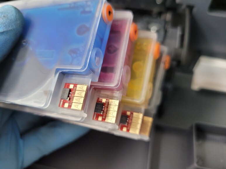 카트리지 문제, 소모품 시스템 문제로 HP 7740 무한잉크가 출력되지 않고 있습니다. 온라인으로 구매한 유한 4칩이 카트리지에 부착되어 있었습니다.온라인으로 구매한 유한 4칩 카트리지로 칩을 모두 제거하였습니다.