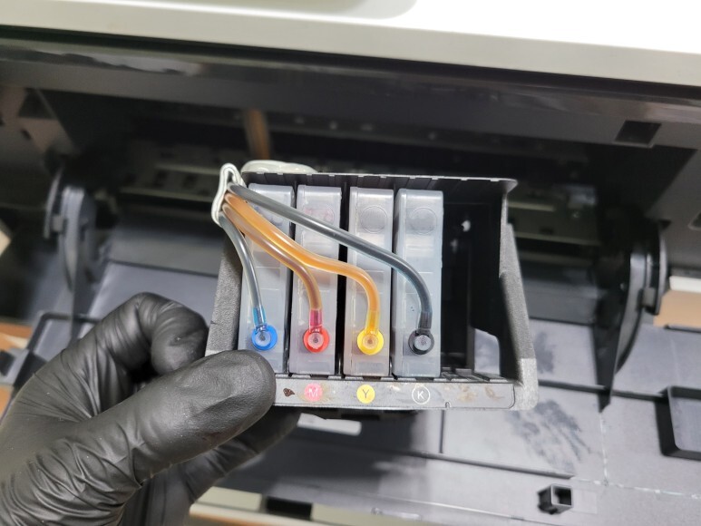 석션하여 호스 및 카트리지 내부에 잉크를 모두 가득 채우고, 1회성 인증칩을 부착 후에 헤드에 재장착하였습니다.