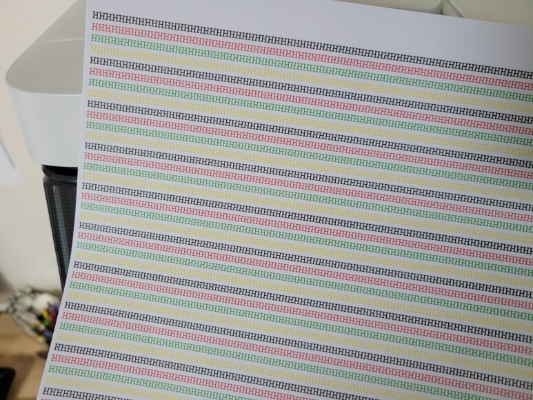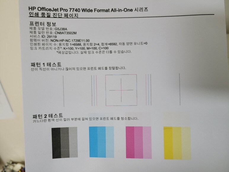 인쇄 품질 진단 페이지를 출력하여 헤드 노즐 상태를 점검하였습니다.