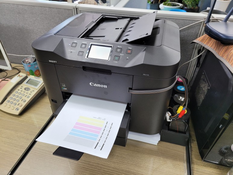 경기도 남양주시에 소재한 식품 생산제조 유통사 사무실에서 사용하는 캐논 MAXYFY MB2720 무한잉크 팩스복합기입니다. 출력이 매우 불량하여 출장 수리 요청, 스케줄을 잡아 이동했습니다.