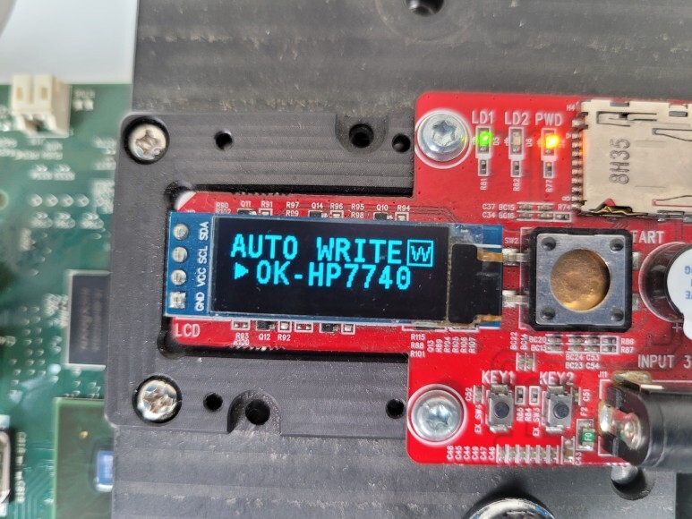 메인보드를 No Chip 펌을 하기 위해 지그에 물리고 전원을 연결했습니다. 메인보드 No Chip 펌 라이팅한 후에 메인보드 재장착 완료했습니다.