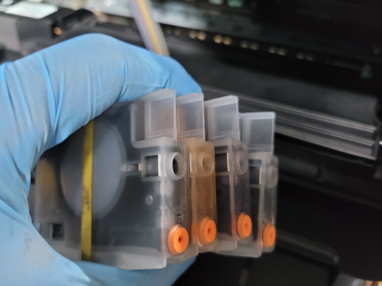칩을 모두 제거하고 No Chip 노칩용 금형카트리지로 교체 후 노칩을 위한 1회 인증칩을 부착, 잉크 석션하여 호스 및 카트리지에 잉크를 모두 가득 채웠습니다.
