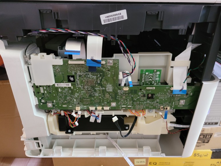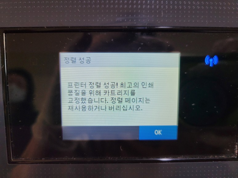전원을 연결하여 초기화 완료 후에 정상적 헤드 정렬 페이지가 출력되고 Chipless Solution(No Chip) 인증을 위해 초기 부착한 인증칩을 제거했습니다.