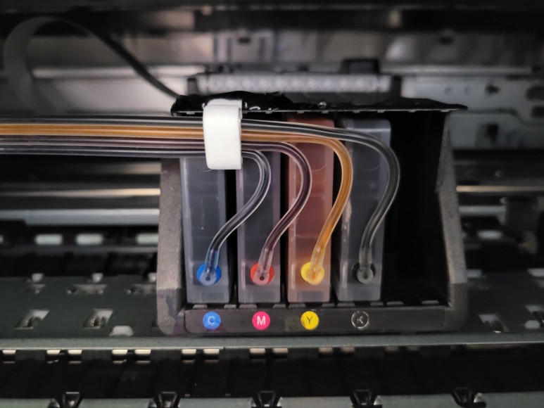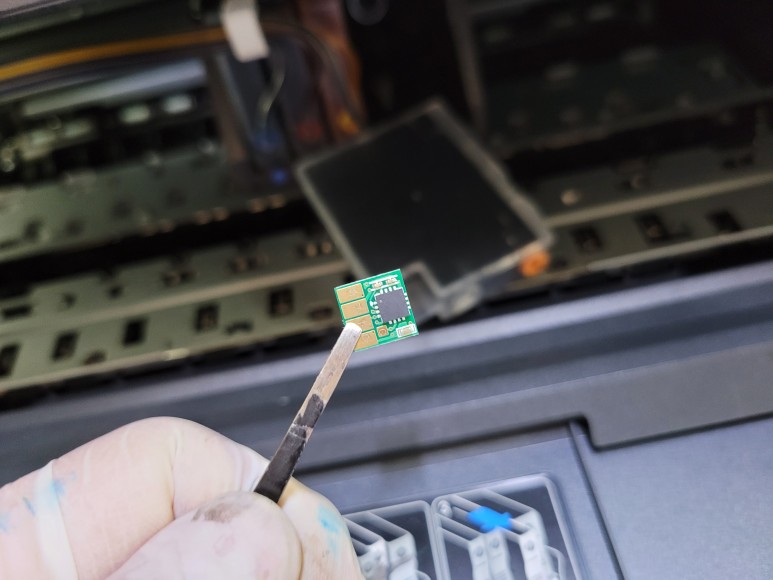 카트리지에 기존 칩을 모두 제거하고 Chipless Solution (No Chip) 인증칩을 하나 부착한 후에 헤드에 재장착했습니다.