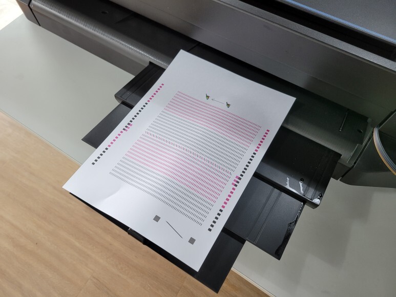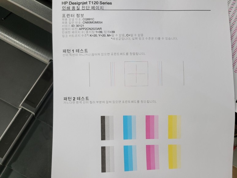 헤드 노즐 점검을 위해 진단페이지를 출력해 확인했습니다.