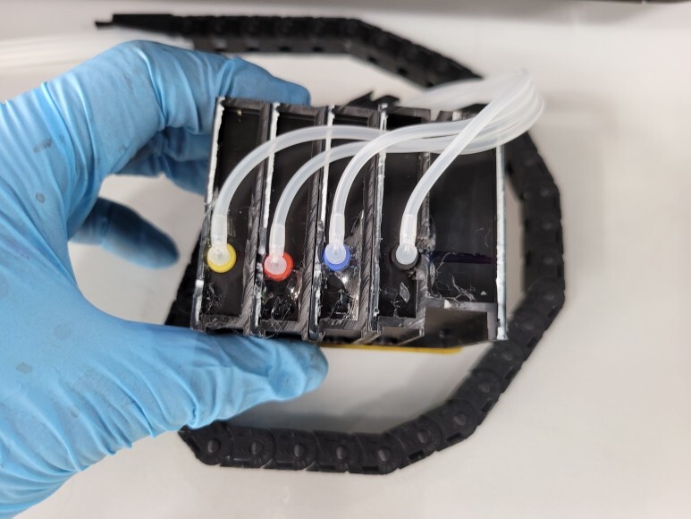 A1 플로터 HP T120 무한잉크 카트리지 잉크 석션하여 호스 및 카트리지 내부에 잉크를 가득 채웠습니다.