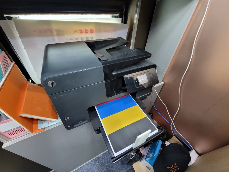 HP 오피스젯 8640 무한잉크 A4 팩스복합기는 내부 혼색이 심하게 되어 있었습니다. 무리하게 헤드 청소를 진행하지 않고 풀배경 출력을 하여 혼색된 헤드 내부을 잉크를 출력해서 빼냈습니다.