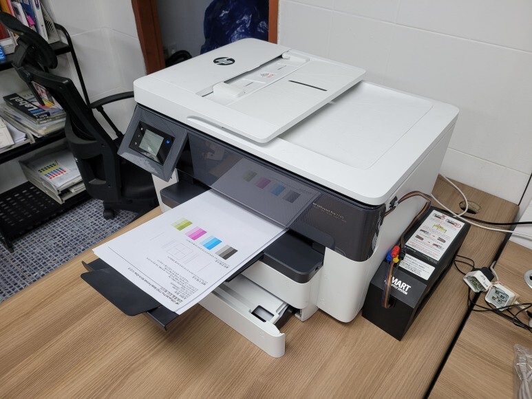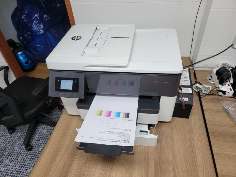 수원시 권선구 소재 소방관련 업체 사무실에서 사용하는 A3 팩스복합기, HP 7740 무한잉크로 잦은 카트리지 문제 및 소모품 시스템 문제로 멈춰버린 유한 4칩 HP 7740 무한잉크 장비를 기업형, B2B용 (보험사, 군부대, 학교, 학원, 부동산, 핸드폰매장, 교육사 등등)으로 사용되는 칩없이 구동하는 기업형 No Chip 무한잉크 장비로 전환 출장수리 요청으로 스케줄 맞춰 방문하여 수리 완료 했습니다.