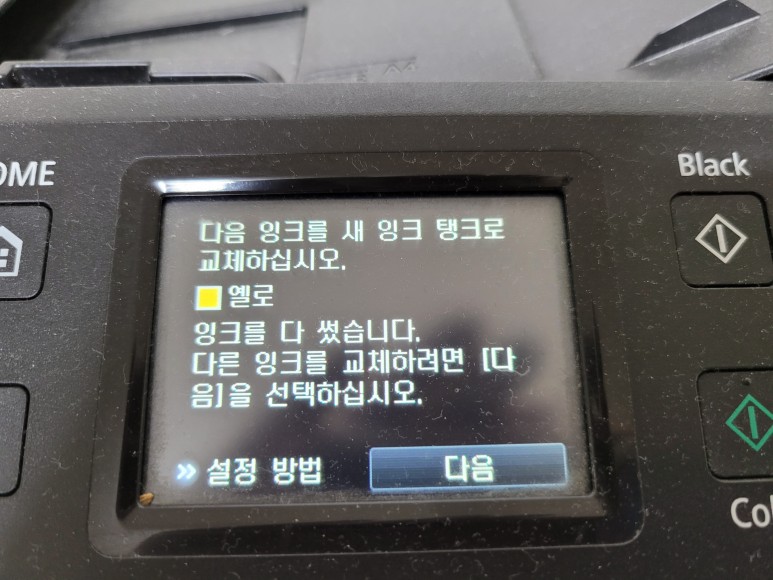 다음 잉크를 새 잉크 탱크로 교체하십시오. 옐로 잉크를 다 썼습니다. 다른 잉크를 교체하러면 다음을 선택하십시오.