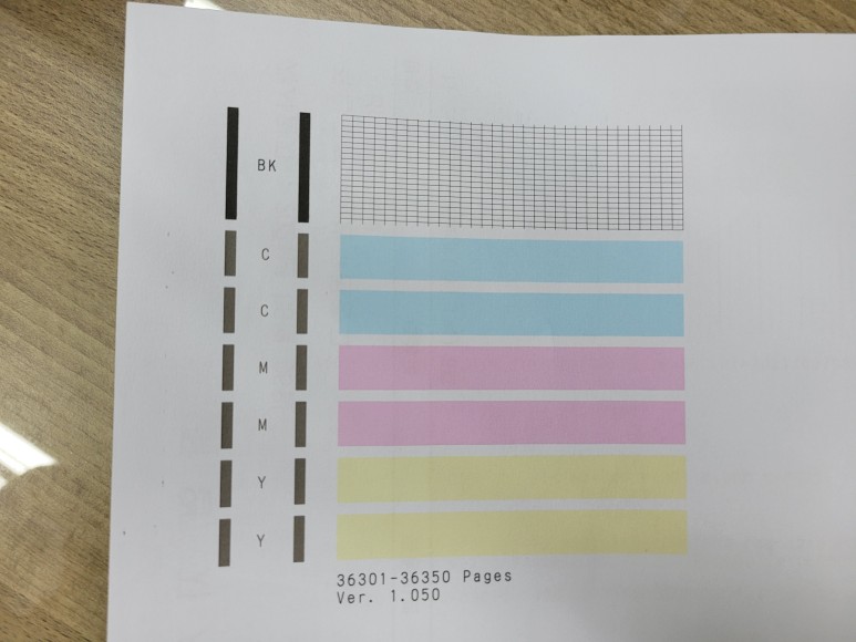 헤드 노즐 점검을 위채 출력하니 검정색을 출력상태가 좋지 않았습니다.