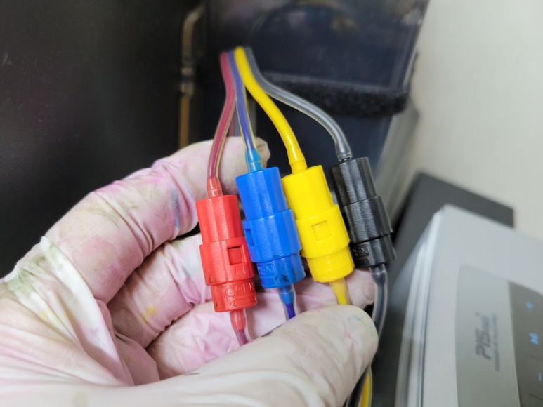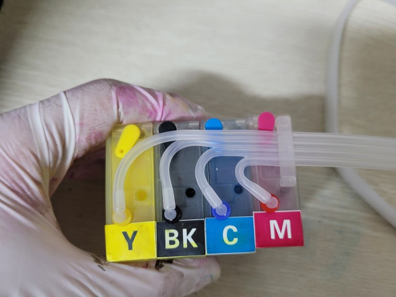 호스를 절단하여 잉크 퀵차단밸브를 장착하고 잉크를 석셕하여 호스 및 카트리지 내부에 잉크를 가득 채웠습니다.