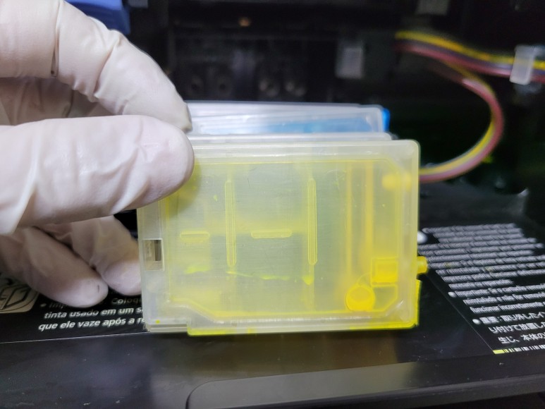 노란색 공급선, 호스에 잉크가 빠지고 경화되어 굳어 잉크가 전혀 공급이 안되고 있었습니다. 카트리지 내부에는 잉크가 전형 없이 비어 있었습니다.
