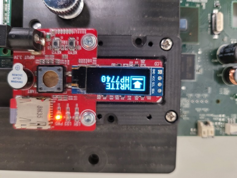 메인보드를 No Chip 펌을 하기 위해 지그에 물리고 전원을 연결했습니다. 메인보드 No Chip 펌 라이팅한 후에 메인보드 재장착 완료했습니다.