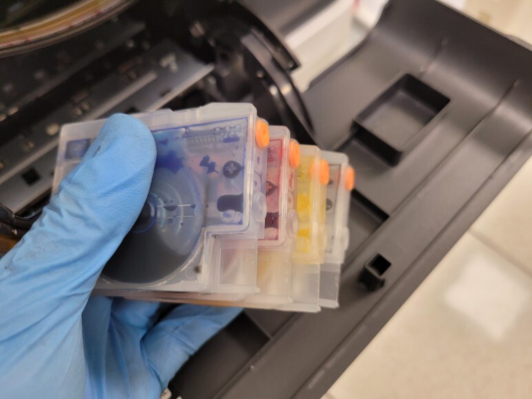 석션하여 호스 및 카트리지 내부에 잉크를 모두 가득 채우고, 1회성 인증칩을 부착 후에 헤드에 재장착하였습니다.
