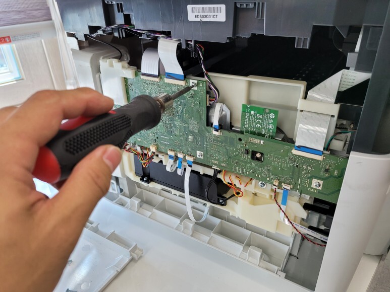 메인보드를 No Chip 펌을 하기 위해 지그에 물리고 전원을 연결했습니다. 메인보드 No Chip 펌 라이팅한 후에 메인보드 재장착 완료했습니다.