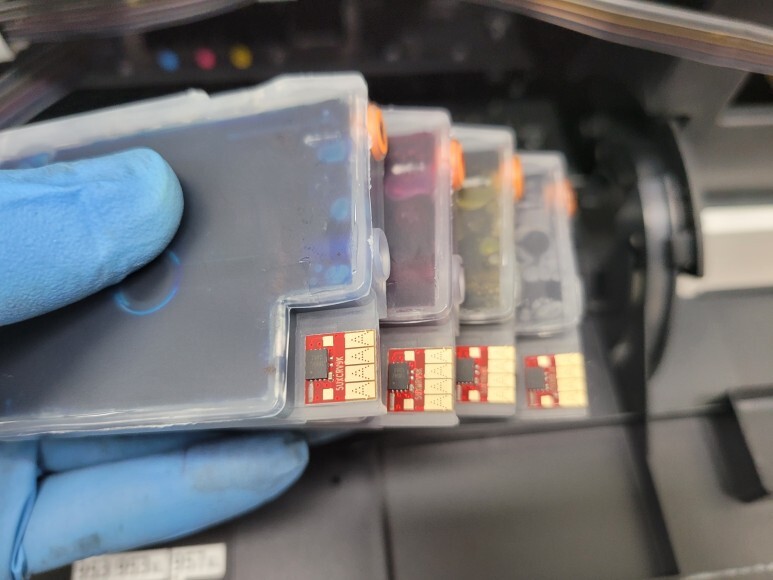 석션하여 호스 및 카트리지 내부에 잉크를 모두 가득 채우고, 1회성 인증칩을 부착 후에 헤드에 재장착하였습니다.