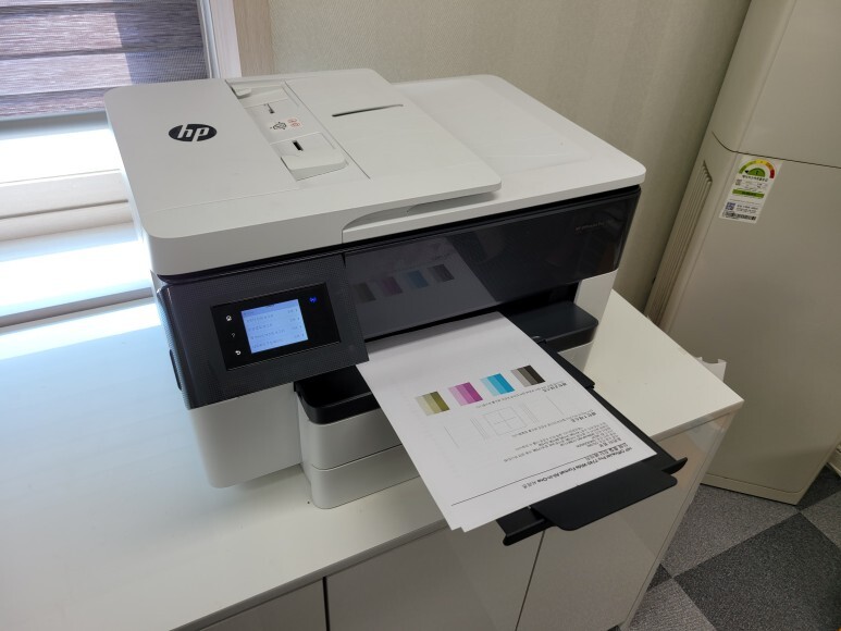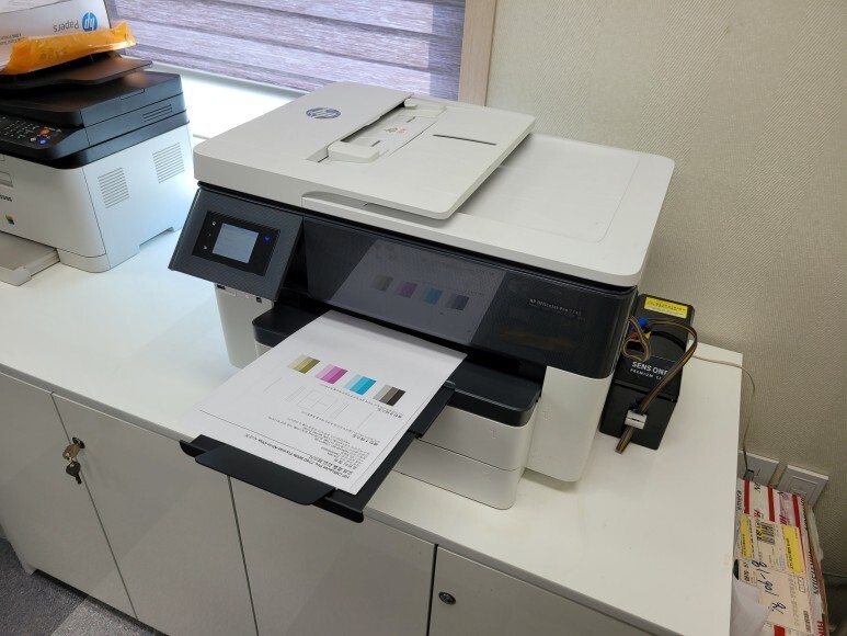 경기도 화성시 배양동 소재 건설사 사무실에서 사용하는 A3 팩스복합기, HP 7740 무한잉크로 잦은 카트리지 문제 및 소모품 시스템 문제로 멈춰버린 유한 4칩 HP 7740 무한잉크 장비를 기업형, B2B용 (보험사, 군부대, 학교, 학원, 부동산, 핸드폰매장, 교육사 등등)으로 사용되는 칩없이 구동하는 기업형 No Chip 무한잉크 장비로 전환 출장수리 요청으로 스케줄 맞춰 방문하여 수리 완료 했습니다.