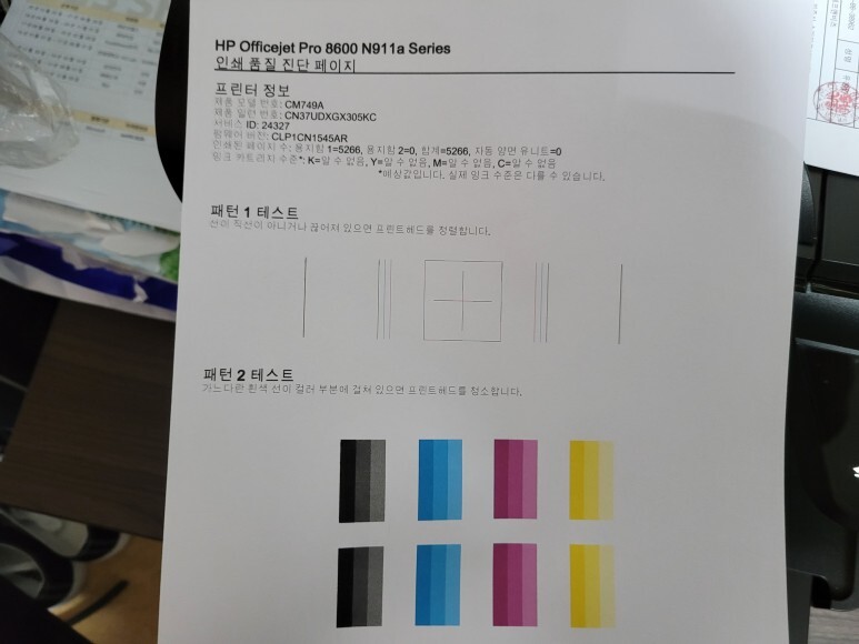 초기화 후에 정상적으로 헤드 정렬 페이지가 출력되었습니다. 헤드 세척 후에 헤드 노즐 상태를 점검하기 위해 인쇄 품질 진단 페이지를 출력했습니다.