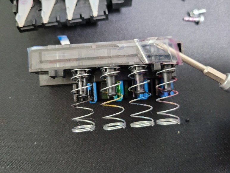 헤드 수리를 위해 세정액 약 200ml, 헤드 석션팁이 장착된 주사기, 8T 별드라이버, 헤라(플라스틱 카드), 핀켓, 탄성접착제, 헤드 챔버 보호 압착 지그, 반투명테이프...를 준비했습니다. 그리고 헤드를 프린터에서 꺼내 분해했습니다.