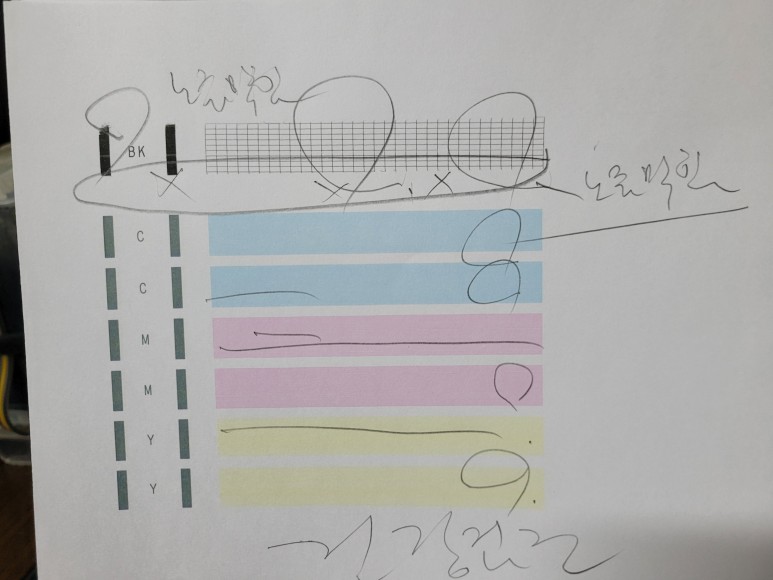 헤드 노즐 점검을 위채 출력하니 검정색을 출력상태가 좋지 않았습니다.