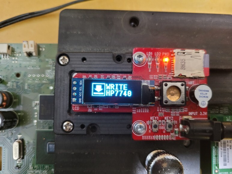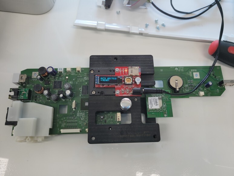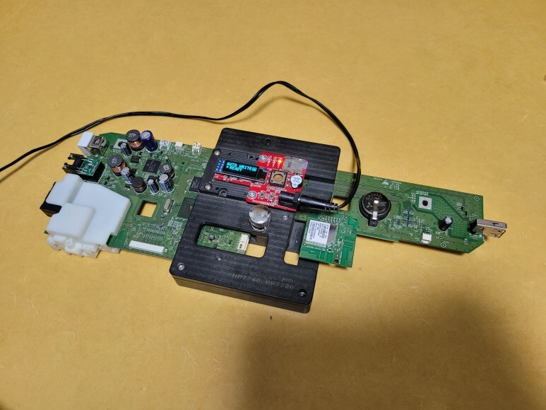 HP 7740 메인보드를 다시 무한잉크 장착을 위해 펌지그에 물리고 전원을 연결했습니다. 메인보드 No Chip 펌 라이팅한 후에 메인보드 재장착 완료했습니다.