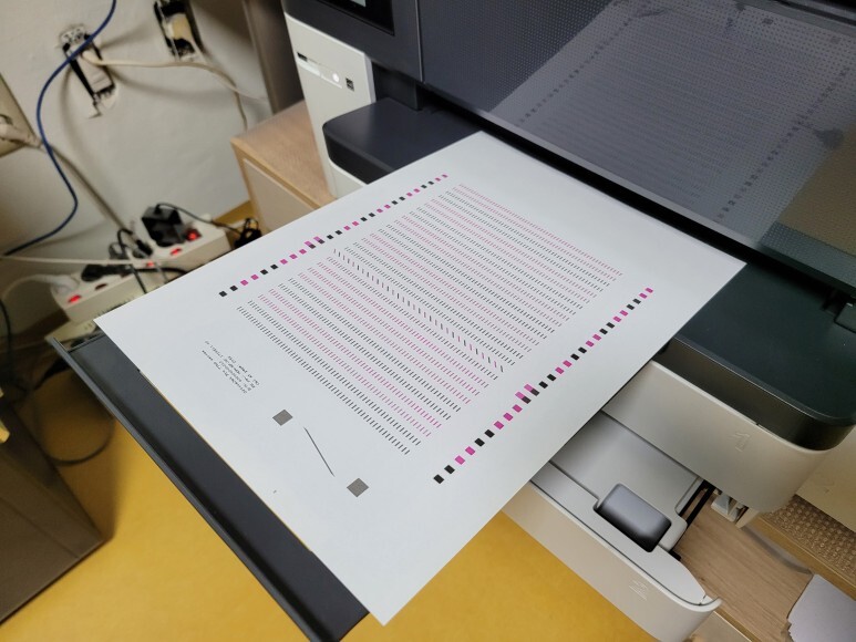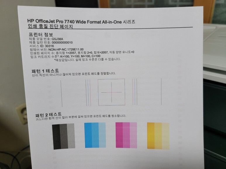 초기화 후에 정상적으로 헤드정렬페이지가 출력되어 나왔습니다. No Chip 전환 완료 후에 1회용 인증칩을 제거했습니다.