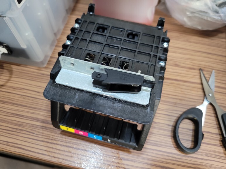 석션하여 잉크를 가득 채운 카트리지를 헤드에 장착하고 체인 결합 고정했습니다.