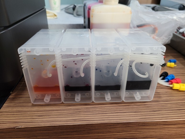 잉크 석션하여 호스 및 카트리지 내부에 가득 채웠습니다.
