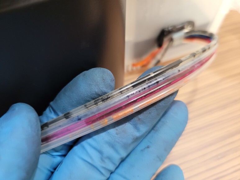 잉크 공급 호스를 보니 잉크가 모두 빠져 있고 잉크가 심하게 경화되어 굳어 막혀 있었습니다.