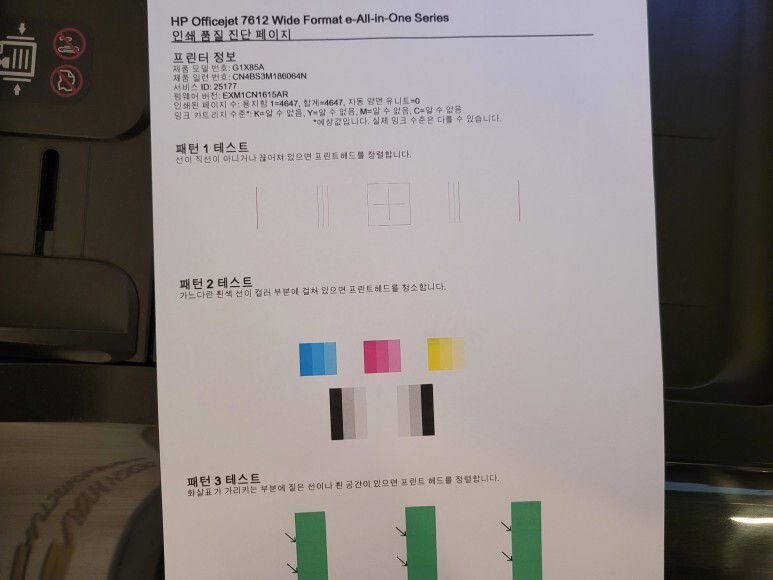 HP 오피스젯 7612 무한잉크 A3 팩스복합기 정상적으로 헤드 정렬 출력되어 나왔습니다.