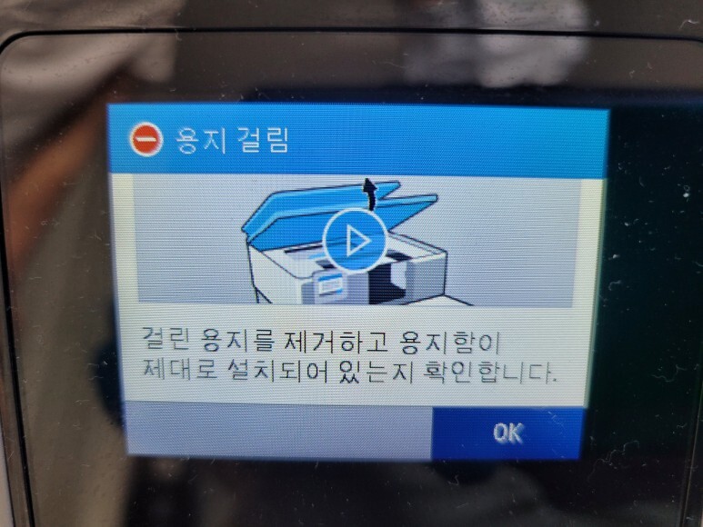 용지걸림으로 멈춰 있었습니다. 내부 잉크 공급선, 호스가 걸리고 정리가 안 되어 있었습니다.