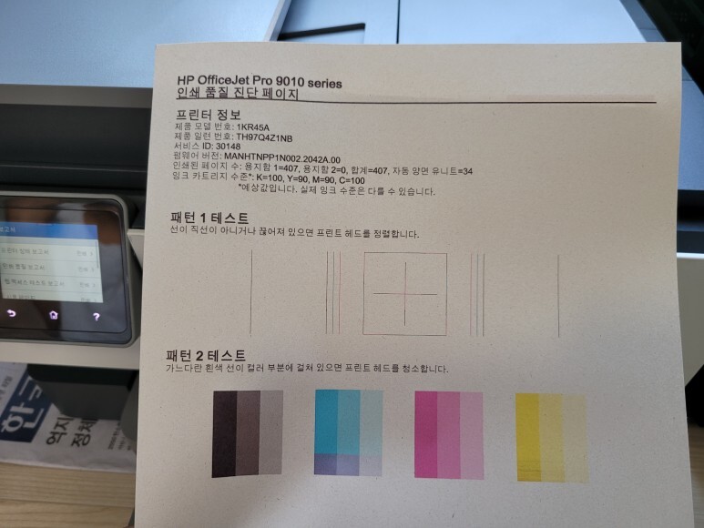 인쇄 품질 진단 페이지를 출력하여 헤드 노즐 상태를 점검하였습니다.