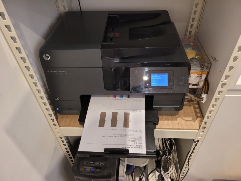 서울시 노원구 소재 사무실에서 사용하는 HP 오피스젯 8640 무한잉크 팩스복합기로 색상 출력이 불량하여 출장수리 요청, 스케줄 잡아 이동 수리 완료했습니다.