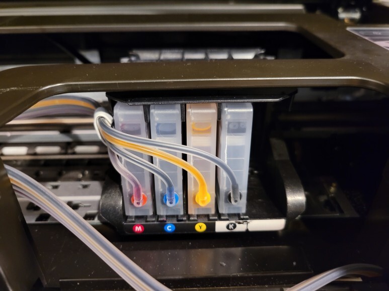 석션된 새 카트리지와 공급선을 모두 교체하고 장착했습니다. 정상적 헤드 정렬 페이지가 출력되어 나왔습니다.