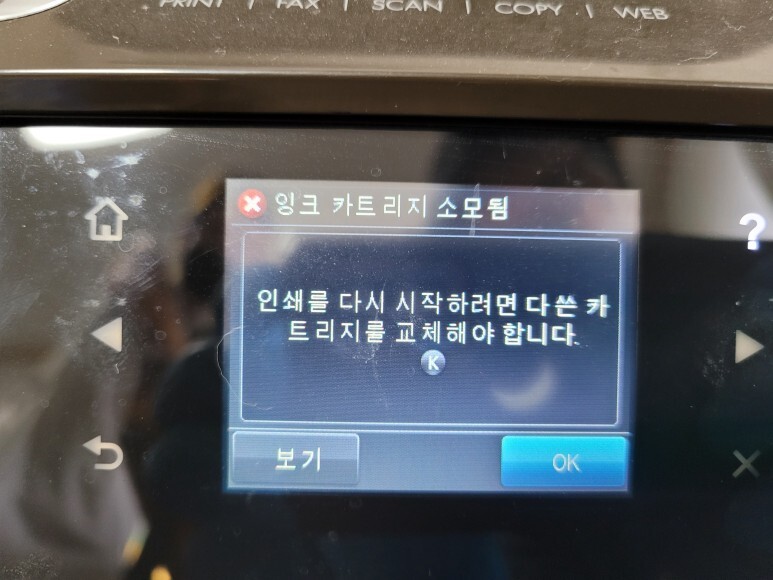 A3 팩스복합기 HP 7612 무한잉크프린터 K 색상, 잉크 카트리지 소모됨 문제로 멈춰 있습니다.