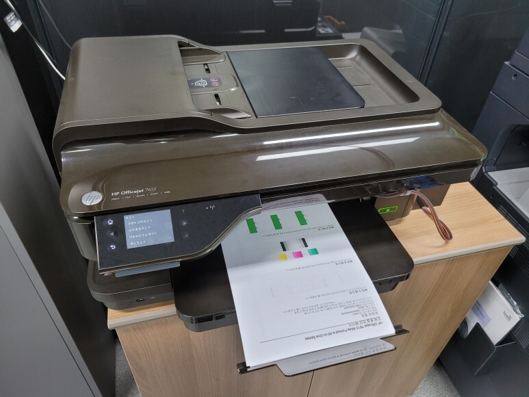 경기도 평택시 서정동 소재, 건축관련 사무실에서 A3 팩스복합기로 사용하는 HP 7612 무한잉크 프린터인데 잉크 카트리지 소모됨 문제로 출장수리 요청, 스케줄 잡아 이동 수리 완료했습니다.