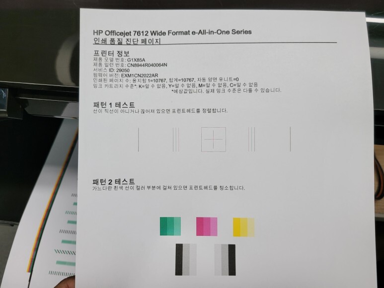 HP 7612 팩스복합기 카트리지를 헤드에 재장착하고 OOBE 리셋 초기화 후, 정상적으로 헤드 정렬 페이지가 출력되어 나왔습니다.