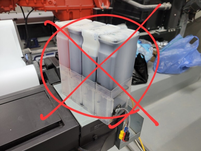 HP T120 24인치 대형프린터 A1 플로터 무한잉크 호스가 막혀 잉크가 전혀 공급이 안 된다고 해서 공급기가 장비 위에 올려져 있어 도착하자마자 퀵차단밸브를 분리해 잉크를 차단했습니다. 절대 들거나 위로 올리시면 안 됩니다.