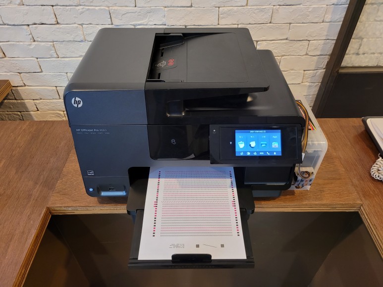 서울시 영등포구 양평동5가에 위치한 아이에스비즈타워 내 회사 사무실에서 사용되는 HP 8660 무한잉크 입니다. 8640, 8660은 국내 출시 장비로 펌업데이트시 문제가 되는 장비로 무한잉크 사용에 조금 장애가 있는 장비입니다. 기존 제작사에게 연락이 안되어 잉크 카트리지 소모됨 에러로 멈춰서 출장수리 요청하여 방문스케줄 잡아 이동, 출장수리 완료했습니다.