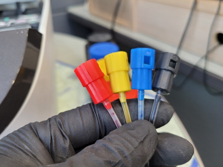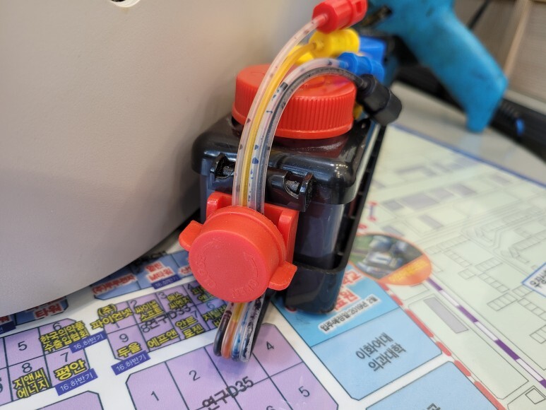 블랙 카트리지는 유투브를 보고 따라 가공했는데 제대로 하지 못해 다시 가공하여 핫멜트로 단단히 천공된 홀을 막고 석션하여 호스 및 카트리지 내부에 잉크를 가득 채웠습니다.