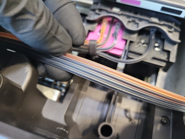 호스를 잘라 양쪽 끝에 잉크 퀵차단밸브를 장착했습니다. 공급기의 공급선도 핫멜트로 고정하여 정리하였습니다.