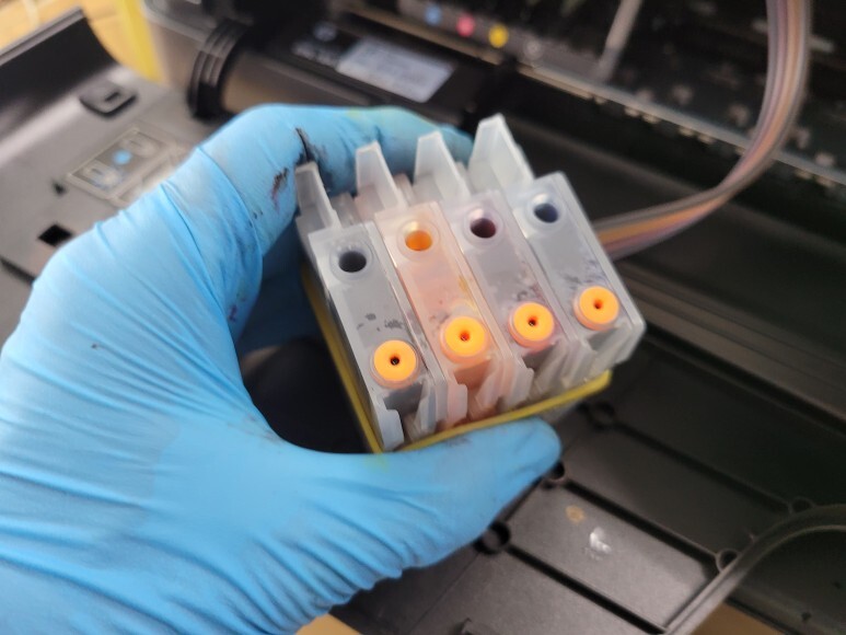 잉크 석션하여 호스 및 카트리지 내부에 잉크를 가득 채우고, 메탈클램프 핫멜트 보강하여 단단히 고정, 호스 정리해 카트리지 재장착했습니다.