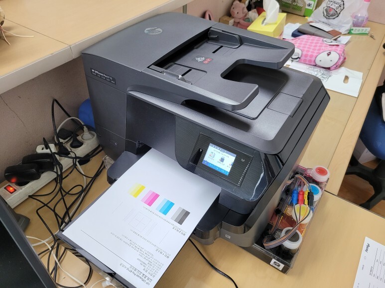 인천 종합물류 회사 사무실에서 사용하는 HP 8710 무한잉크 A4 팩스복합기인데 출력상태가 불량하여 출장수리 요청, 스케줄 잡아 이동하여 수리 완료했습니다.