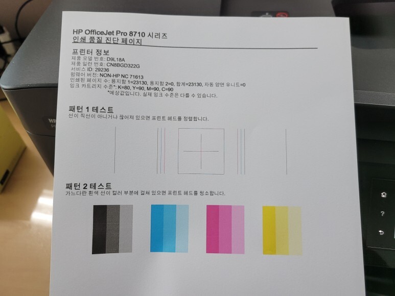 헤드 노즐 점검을 위해 인쇄 품질 진단 페이지를 출력했습니다. 헤드 및 인쇄 품질 양호