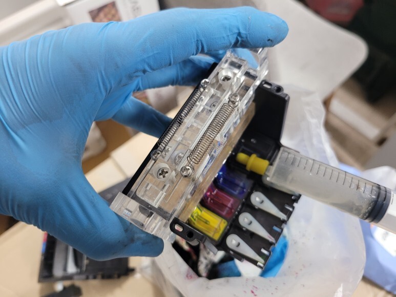 출력불량 헤드를 분해하여 탄성접착베 도포 및 테이핑 보강했습니다.