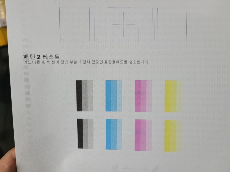 헤드 노즐 점검을 위해 진단페이지를 출력해 확인했습니다.