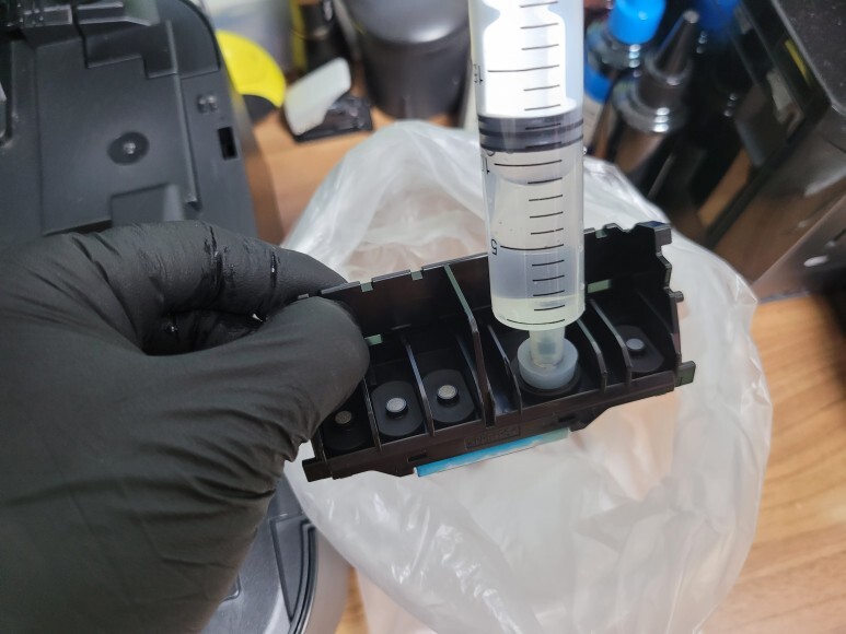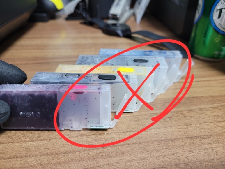 기존 훼손된 카트리지를 모두 폐기하고 새로운 충전식 카트리지에 주사기로 잉크주입하여 고무마개를 막았습니다.