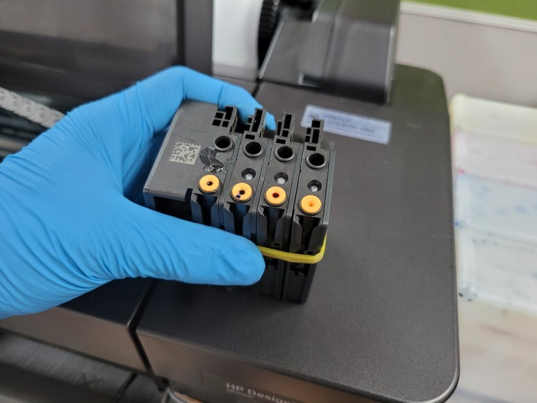 HP T120 24인치 플로터 무한잉크의 헤드에 결합된 체인을 분리 후, 카트리지를 눌러 뺐습니다.
