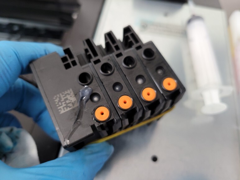 3) 미세한 노즐 막힘은 헤드 챔버 부분을 터지게 합니다. 사람도 뇌혈관이 막히면 터져 사망에 이르게 됩니다. 헤드도 노즐이 막히면 헤드가 터져 잉크가 흐르고 교체해야 하는 비용을 지불하거나 폐기해야 합니다. (중환자수술 또는 뇌출혈사망)