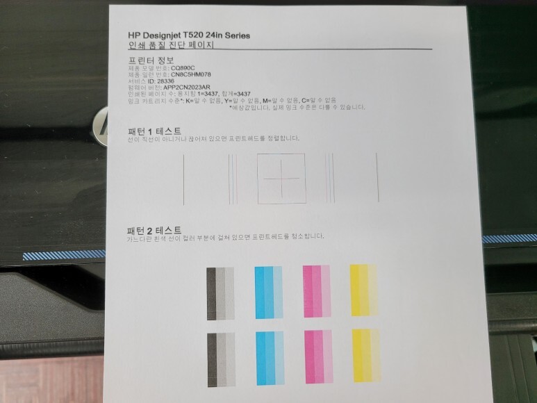 HP T520 24인치 플로터 무한잉크 헤드 노즐 점검을 위해 진단페이지를 출력해 확인했습니다.